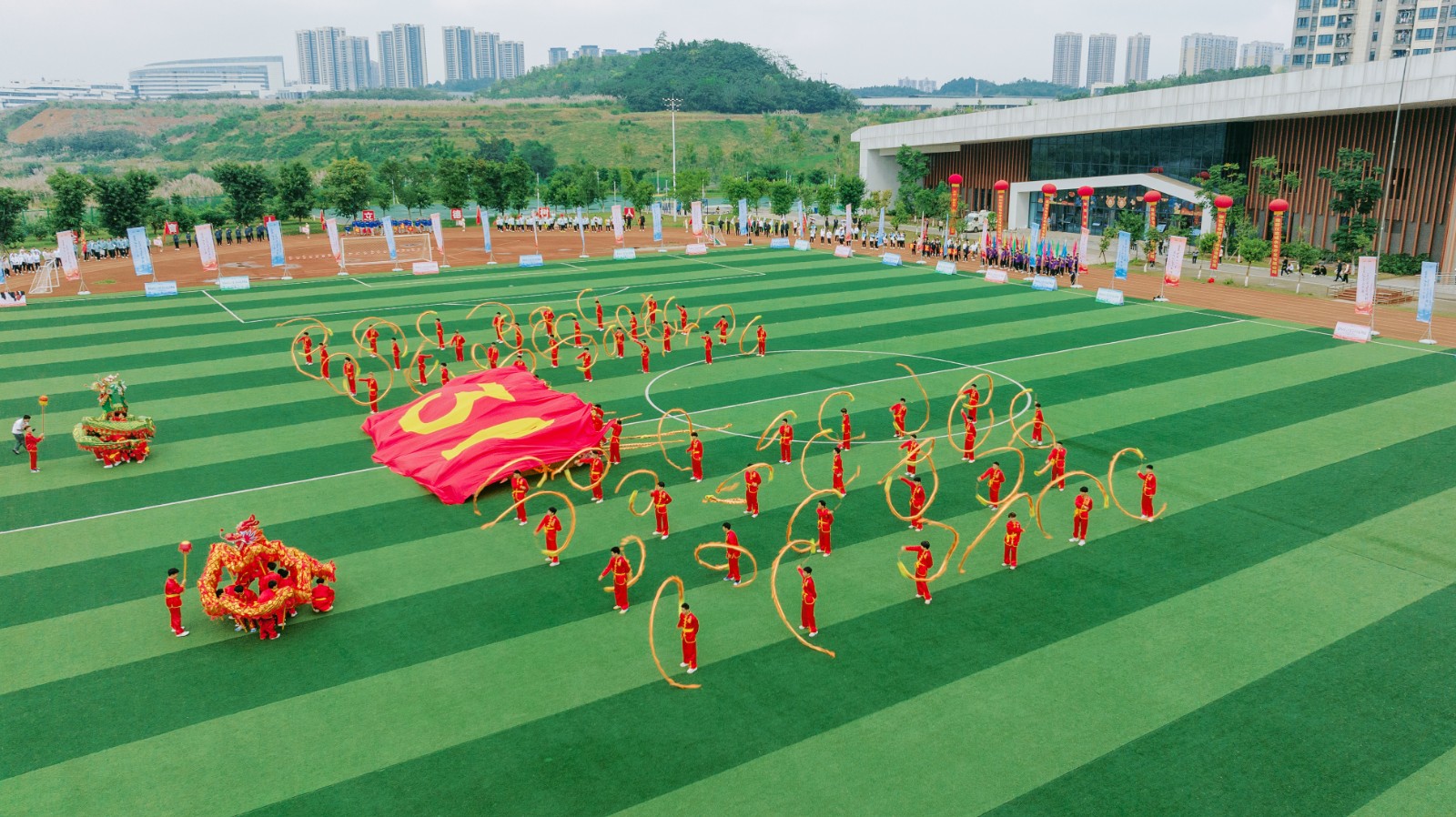 開幕式現(xiàn)場,彩旗招展,氣氛熱烈。15時整,在氣勢恢宏的舞龍表演后,運動會開幕式正式開始。伴隨著激昂的旋律,儀仗隊員護擁著鮮艷的五星紅旗健步入場。隨后,各參賽代表團依次入場并進行風(fēng)采展示,精心準備的舞蹈、歌曲等文藝節(jié)目,引燃全場氣氛。入場式后,全場起立,高唱中華人民共和國國歌。在雄壯的國歌聲中,鮮艷的五星紅旗冉冉升起,迎風(fēng)飄揚。