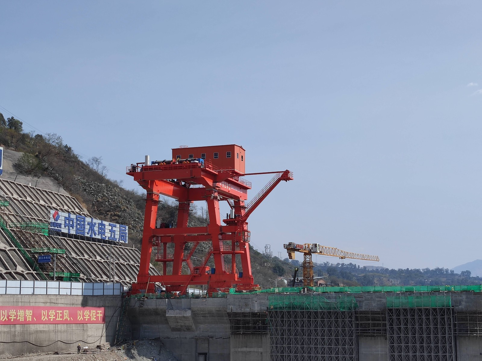 紅色門機(jī)迎江矗立?!按蟮踯囌鎱柡?,百噸設(shè)備輕而易舉提抓起來!”今年以來,攀枝花廣大市民陡然發(fā)現(xiàn)銀江水電站大壩上架起了一個(gè)紅色的大型設(shè)備,從幾公里外的市區(qū)一眼望去就能映入眼簾,成為銀江水電站的新標(biāo)志。這個(gè)紅色巨物就是壩頂門機(jī),高25米,寬16米,最大起吊能力達(dá)到500噸,起升高度達(dá)75米。是水電站建設(shè)期金屬結(jié)構(gòu)安裝及后期電站運(yùn)行最重要的設(shè)備之一,2024年將肩負(fù)起包括36扇閘門在內(nèi)共計(jì)超萬噸的設(shè)備起吊任務(wù)。為順利推進(jìn)施工,開年以來,川投能源攀水電公司通過增加臨時(shí)軌道提前籌備、堅(jiān)持春節(jié)不停工等措施,加快實(shí)施壩頂門機(jī)供貨安裝,計(jì)劃4月中旬投入使用。