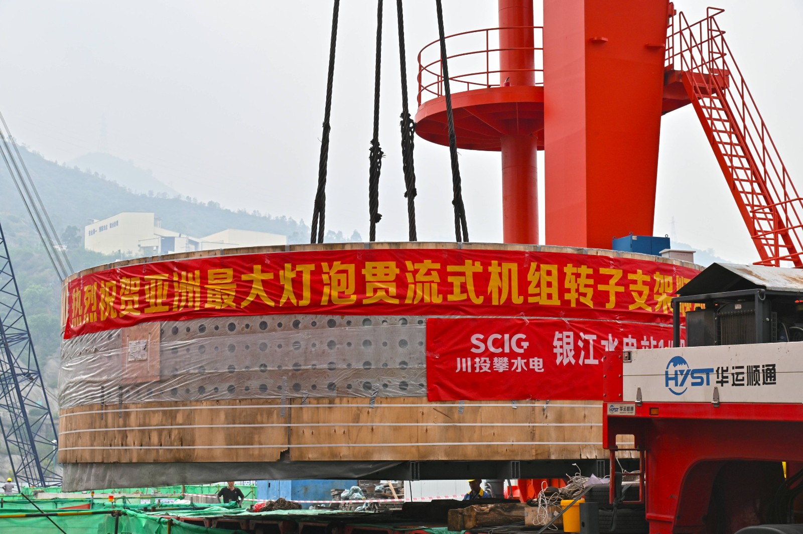 當(dāng)日上午,攀水電公司和參建單位職工齊聚壩頂,共同迎接歷經(jīng)艱難、遠(yuǎn)道而來(lái)的“重要成員”。據(jù)攀水電公司相關(guān)負(fù)責(zé)人介紹,該轉(zhuǎn)子支架具有設(shè)備巨大、運(yùn)輸困難、作用重要三個(gè)特征。設(shè)備之“重”。轉(zhuǎn)子支架直徑達(dá)8米,高2米有余,重達(dá)百余噸,是目前亞洲最大的燈泡貫流式機(jī)組轉(zhuǎn)子支架。運(yùn)輸之“難”。轉(zhuǎn)子支架于4月22日從江蘇鎮(zhèn)江碼頭開(kāi)始運(yùn)輸,先乘船再坐車,途中克服了大件超寬超限、持續(xù)降雨、道路塌方等諸多不利因素,多次調(diào)整運(yùn)輸路線,風(fēng)雨無(wú)阻,日夜兼程,歷時(shí)66天,跨越7個(gè)省份,全程3062公里,在沿途交警的護(hù)送下安全抵達(dá)。作用之“要”。轉(zhuǎn)子支架作為機(jī)組的核心部件,為磁軛一體圓盤式結(jié)構(gòu),中心體采用整圓鍛鋼與磁軛圈焊接組成,對(duì)轉(zhuǎn)子磁軛垂直度、磁軛圓度等加工精度要求極高,決定著機(jī)組的運(yùn)行性能、運(yùn)行效率和安全穩(wěn)定性。