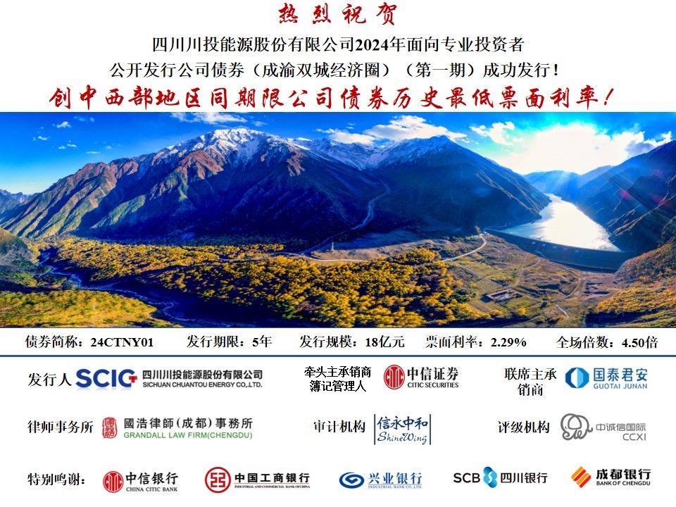 7月10日,川投能源2024年面向?qū)I(yè)投資者公開發(fā)行公司債券(成渝雙城經(jīng)濟圈)(第一期)成功發(fā)行。本期公司債券發(fā)行規(guī)模18億元,期限5年,票面利率2.29%,創(chuàng)中西部地區(qū)同期限公司債券歷史最低發(fā)行票面利率。
