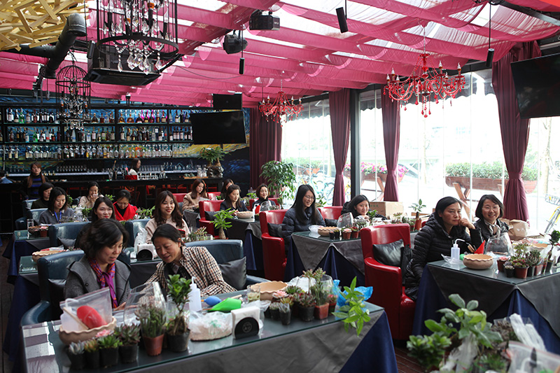 隨后,園藝老師向大家介紹了多肉植物的類別品種、形態(tài)特征、栽培方法以及微景觀的藝術設計與賞鑒。在體驗環(huán)節(jié),面對一棵棵萌態(tài)可掬的“小鮮肉”,栩栩如生的小擺飾,精美別致的花盆,大家興奮不已,躍躍欲試。工作中干練的女漢子變成了心靈手巧的園藝師,她們小心翼翼地將嬌柔的植物安入花內(nèi),鋪上彩色石子,放上小飾品,每個人都發(fā)揮著豐富的想象和新奇的創(chuàng)意,一座座“迷你小花園”各具特色,極富設計感。大家紛紛拿出手機拍下作品,記錄下活動的美好瞬間。喜歡養(yǎng)花的姐妹們還向老師請教花卉種植和養(yǎng)護知識,每個人的臉上都洋溢著輕松和愉悅。