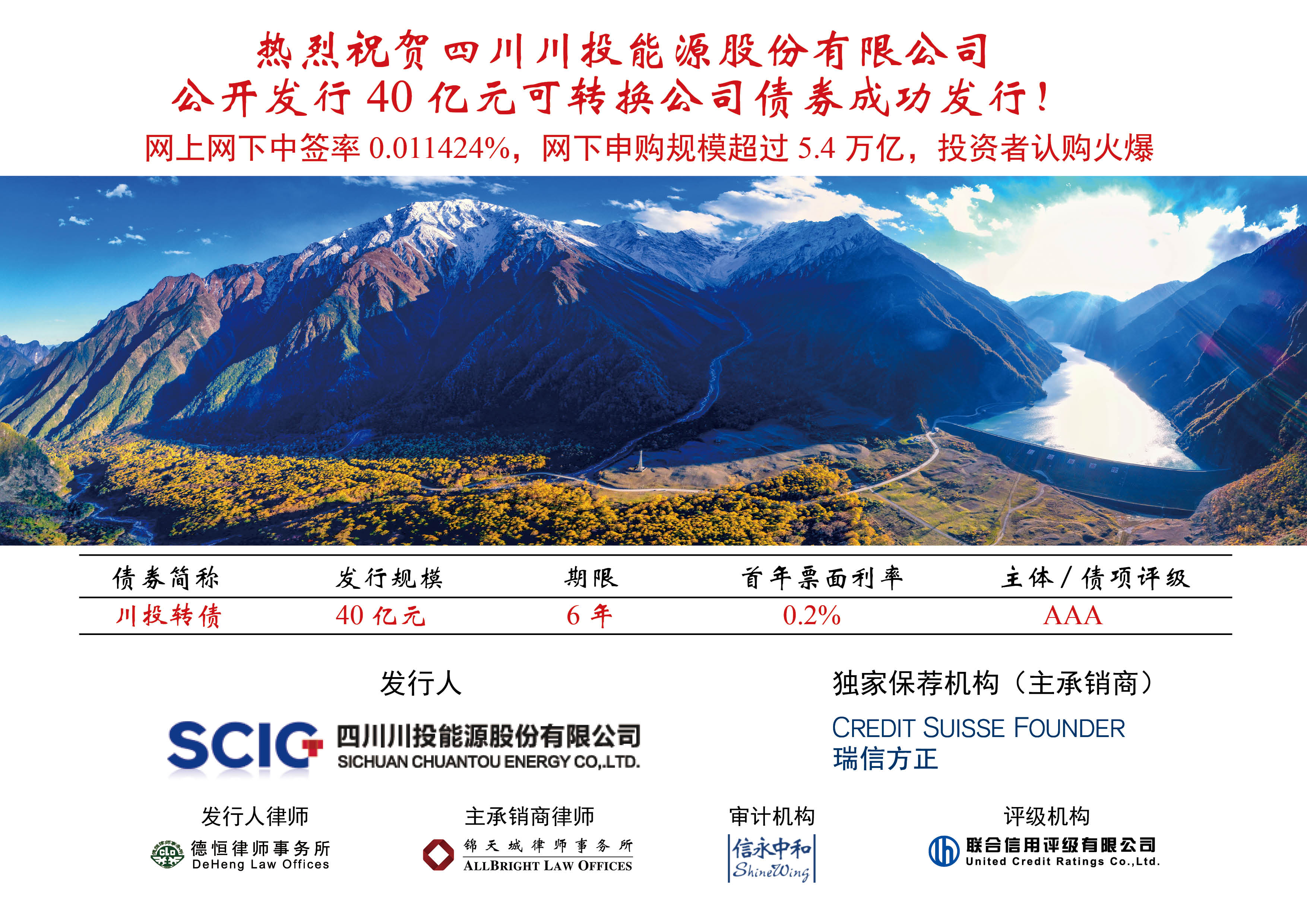 2019年11月15日,四川省投資集團(tuán)有限責(zé)任公司(簡(jiǎn)稱(chēng)“川投集團(tuán)”)控股四川川投能源股份有限公司(簡(jiǎn)稱(chēng)“川投能源”,600674.SH)公開(kāi)發(fā)行A股40億元可轉(zhuǎn)換公司債券工作取得圓滿(mǎn)成功!40億元募集資金已全額到賬!這不僅是川投能源歷史上規(guī)模最大的一次融資,更標(biāo)志著川投集團(tuán)控股的川投能源上市公司6年資本市場(chǎng)融資工作實(shí)現(xiàn)破冰。對(duì)于川投集團(tuán)和川投能源優(yōu)化融資債務(wù)結(jié)構(gòu),做優(yōu)做強(qiáng)做大能源主業(yè),以及促進(jìn)四川省國(guó)有企業(yè)借助資本市場(chǎng)實(shí)現(xiàn)高質(zhì)量發(fā)展意義重大!