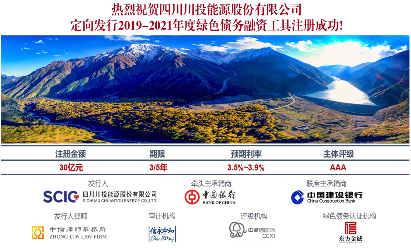 2月18日,川投能源迎來“定向發(fā)行2019-2021年度綠色債務(wù)融資工具”注冊(cè)成功的好消息。本次私募債注冊(cè)金額30億元,公司可在注冊(cè)額度內(nèi)分批次或一次性發(fā)行,募集資金將定向用于公司投資的綠色項(xiàng)目建設(shè),期限3/5年。此次為川投能源首次成功注冊(cè)私募債綠色債務(wù)融資工具,牽頭主承銷商為中國銀行。私募債發(fā)行利率將根據(jù)發(fā)行時(shí)的市場(chǎng)情況確定,預(yù)期在3.5%-3.9%之間(3-5年期限),遠(yuǎn)低于同期限銀行貸款基準(zhǔn)利率。