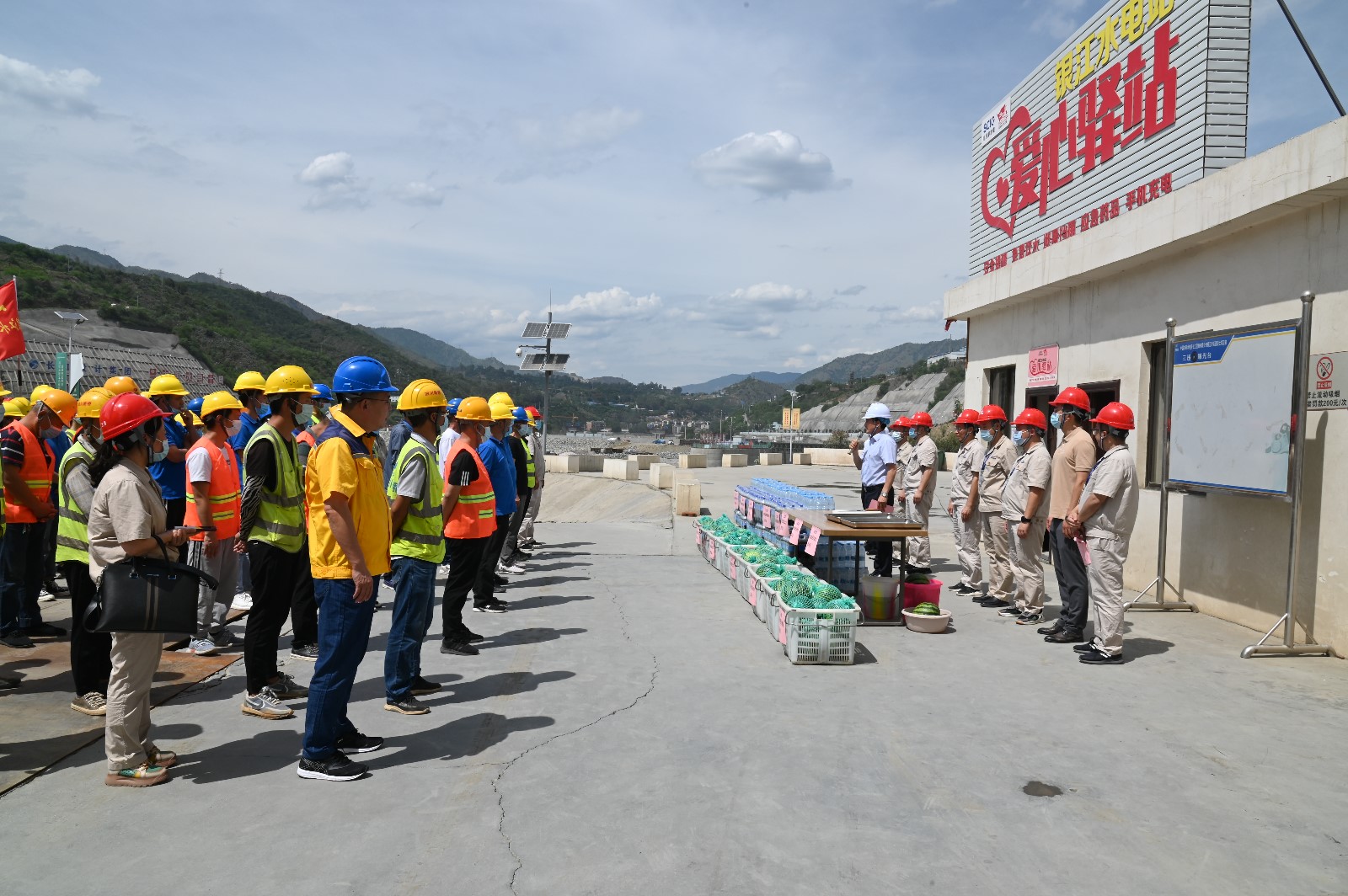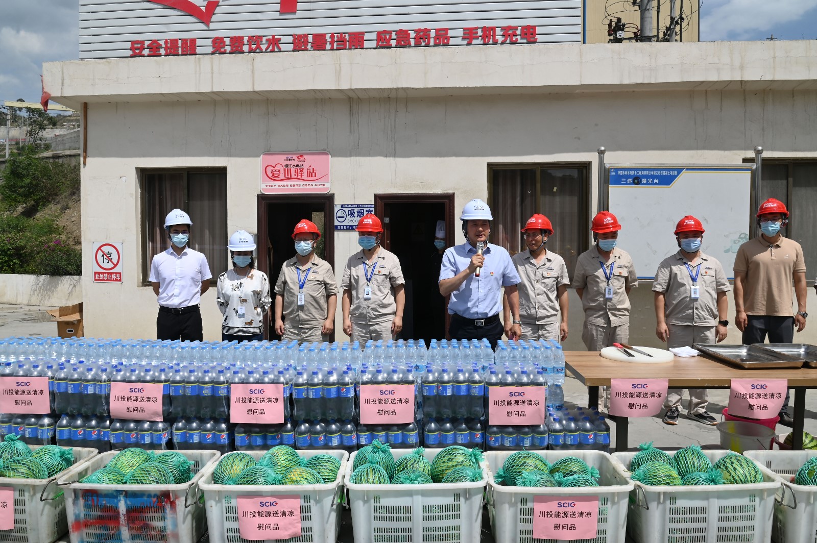 夏至剛過,高溫來襲,攀枝花已進入了高溫酷暑季節(jié)。6月22日下午,為落實全國總工會《關(guān)于做好2022年職工防暑降溫工作的通知》要求,受川投能源黨委書記、副董事長、總經(jīng)理楊洪的委托,川投能源黨委副書記、工會主席冉蘭平一行頂著烈日高溫,專程到銀江水電站工地看望慰問堅守在高溫酷暑中的一線建設(shè)者。川投能源人力資源部經(jīng)理王歆、紀檢工作部陳一鳴及攀水電公司領(lǐng)導(dǎo)、志愿者服務(wù)隊參加慰問。