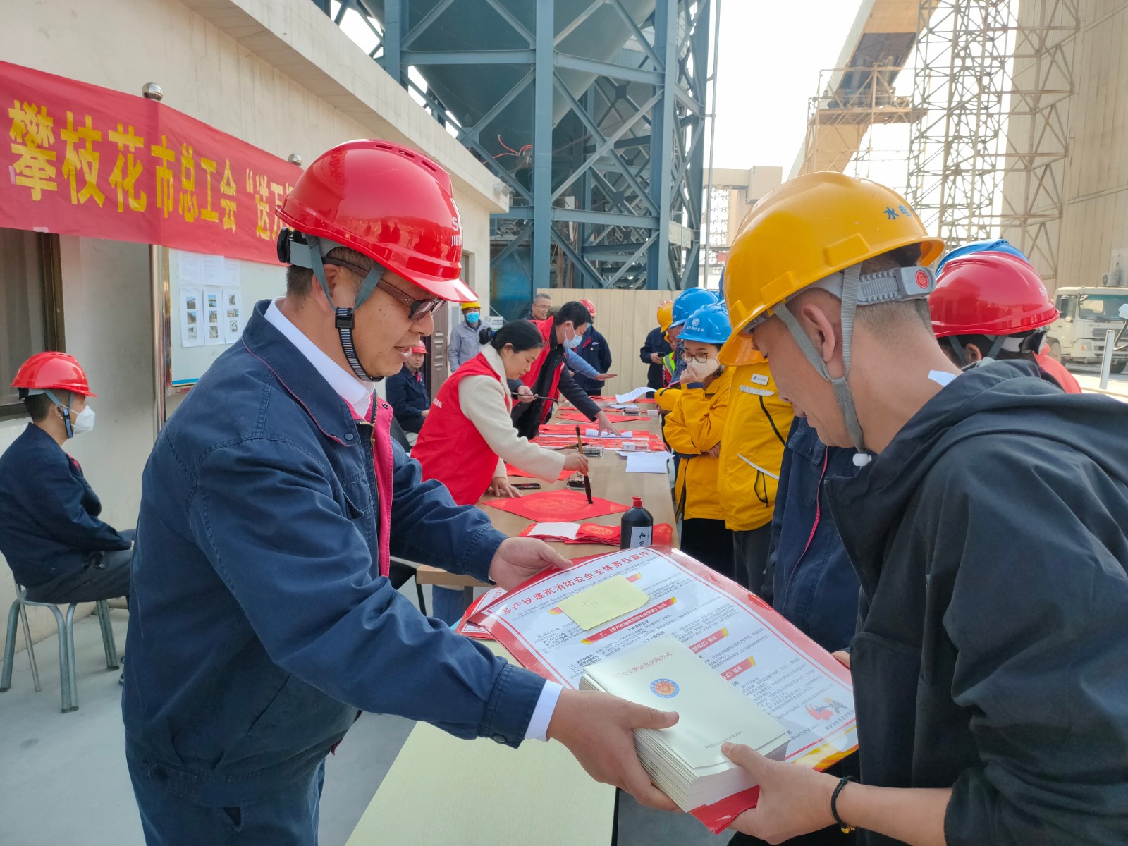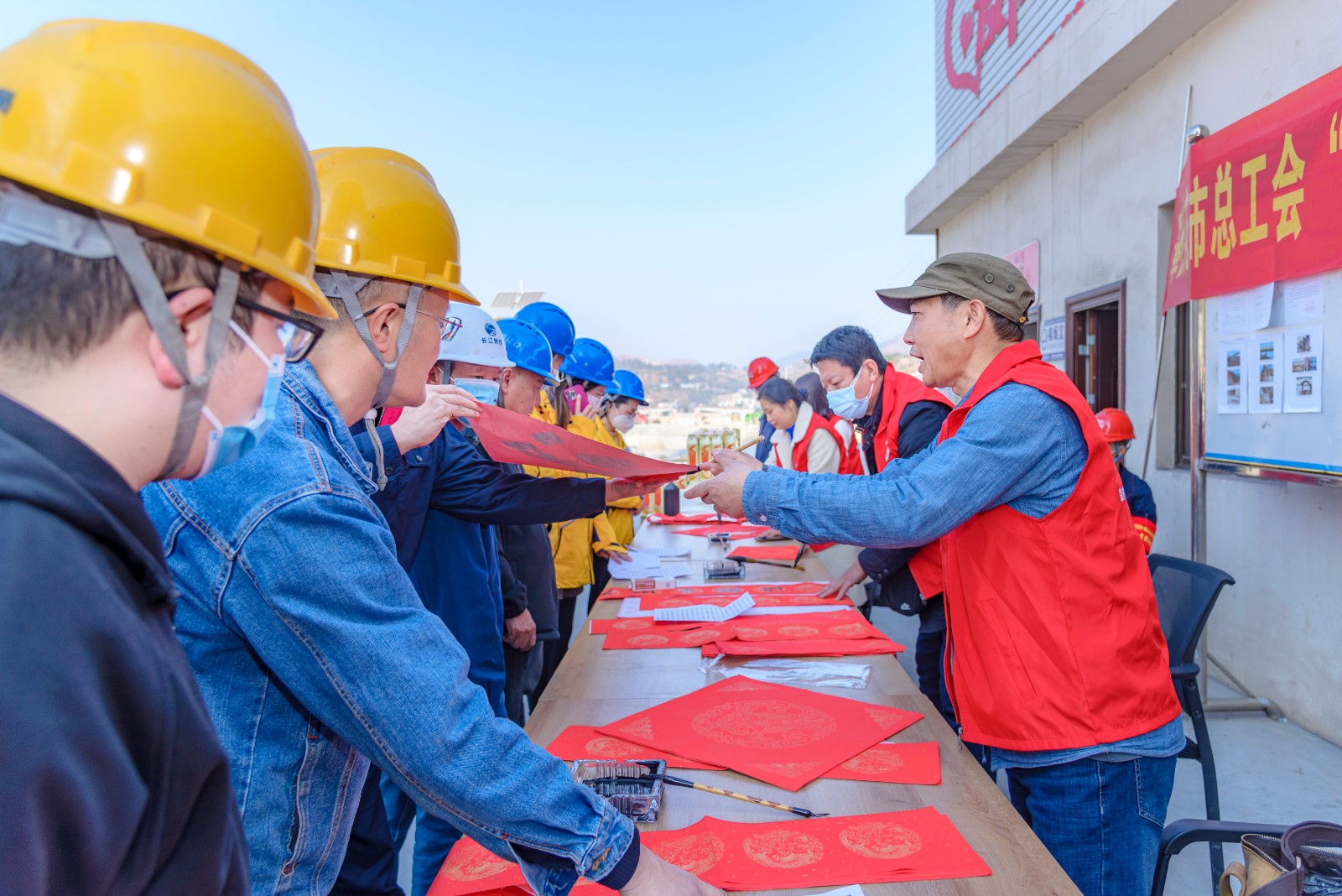 1月17日,公司工會(huì)與攀枝花市總工會(huì)聯(lián)合組織開(kāi)展了送萬(wàn)福、送慰問(wèn)、宣傳消防安全等活動(dòng)。邀請(qǐng)書(shū)法大師為春節(jié)期間堅(jiān)守在工程建設(shè)一線職工繪“?!弊?、寫(xiě)春聯(lián)。在“愛(ài)心驛站”活動(dòng)現(xiàn)場(chǎng),鋪著紅色春聯(lián)紙的桌子呈一字型排開(kāi),書(shū)法大師們帶著滿滿的誠(chéng)意與祝福,揮毫潑墨,大家手捧一副副精美的春聯(lián),一個(gè)個(gè)火紅喜慶的“福”字以及新春大禮包,喜悅之情溢于言表。