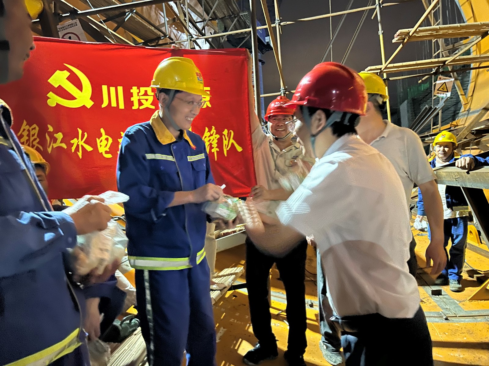 節(jié)日的銀江水電站施工現(xiàn)場(chǎng),大壩混凝土澆筑、廠房尾水管機(jī)電安裝、混凝土拌和系統(tǒng)等各部位一片忙碌,為按期實(shí)現(xiàn)各項(xiàng)節(jié)點(diǎn)目標(biāo),800余名建設(shè)者依然奮戰(zhàn)在銀江水電站施工現(xiàn)場(chǎng)。夜晚的工地更是燈火通明,晚上九點(diǎn),川投能源副總經(jīng)理,公司黨總支書記、董事長(zhǎng)徐孝剛帶領(lǐng)公司黨員先鋒隊(duì)、志愿者服務(wù)隊(duì),深入混凝土澆筑倉(cāng)面、尾水管、拌合樓調(diào)度室、防汛值班室、變電站、保安亭等部位,將熱乎乎的雞腿、香噴噴的粽子等慰問品送到正在施工的每位工友手上。徐孝剛講到:“端午節(jié)是中華民族重要的傳統(tǒng)節(jié)日,對(duì)大家堅(jiān)持奮戰(zhàn)在銀江水電站施工現(xiàn)場(chǎng)斗酷暑、戰(zhàn)高溫、挑燈夜戰(zhàn)表示感謝,祝福大家端午安康!”活動(dòng)中,徐孝剛還開展了夜間安全檢查,叮囑大家做好防護(hù)、確保施工安全。