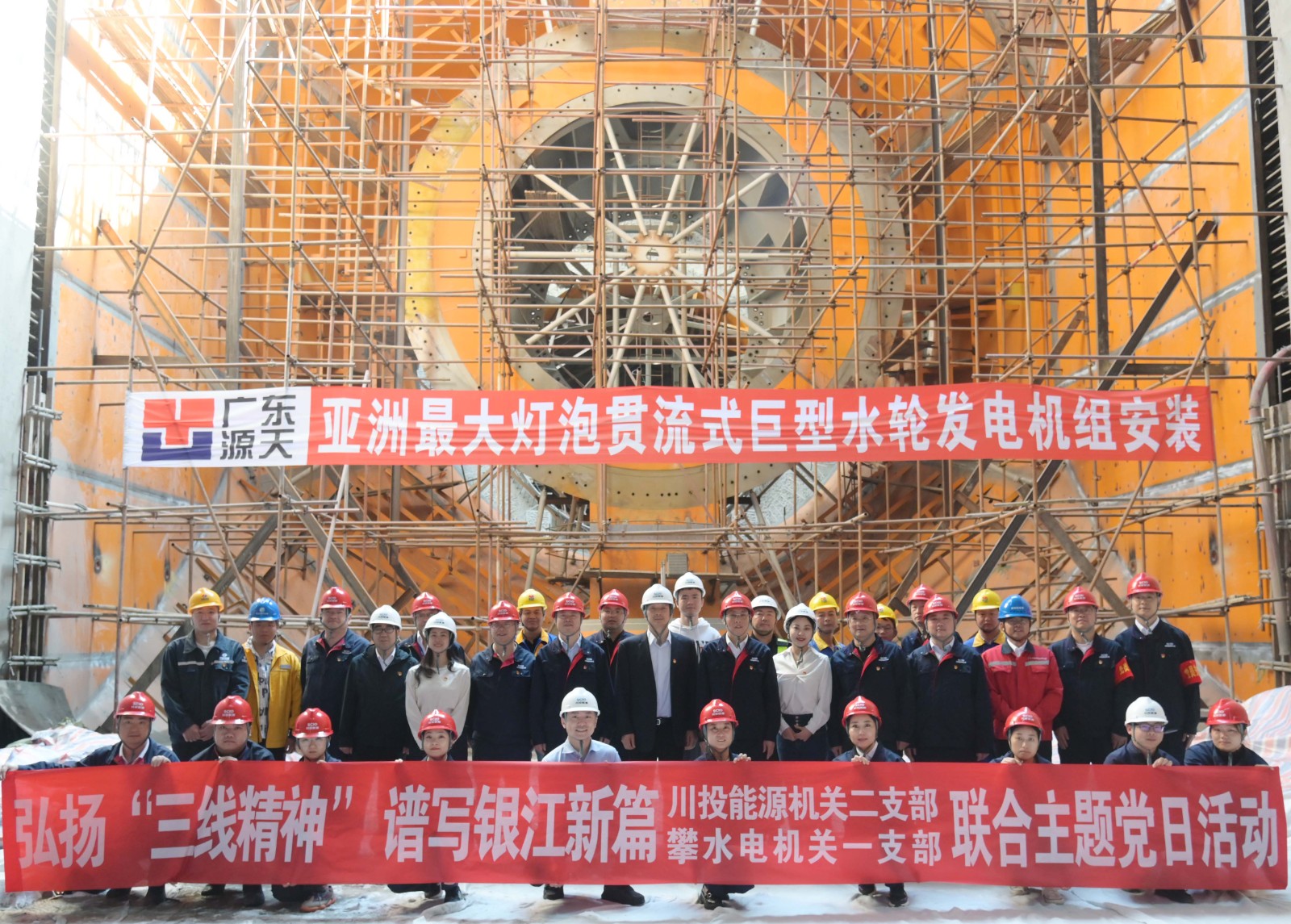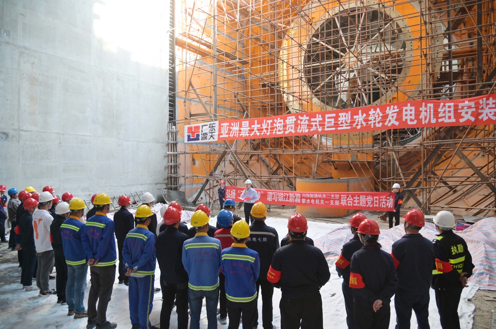 在銀江水電站亞洲最大燈泡貫流式巨型水輪發(fā)電機(jī)組安裝現(xiàn)場(chǎng),川投能源機(jī)關(guān)二支部書(shū)記李睿講授了工地微黨課《承諾》,與大家一起重溫銀江水電站建設(shè)過(guò)程中的感人故事?;顒?dòng)中,徐孝剛用通俗易懂的語(yǔ)言,為現(xiàn)場(chǎng)同志介紹了銀江水電站的建設(shè)特點(diǎn)、施工情況和下一步工程建設(shè)計(jì)劃,并號(hào)召全體黨員和團(tuán)員青年要圍繞“保一爭(zhēng)二”提前發(fā)電重要目標(biāo),團(tuán)結(jié)一心、勇挑重?fù)?dān)、善作善成。