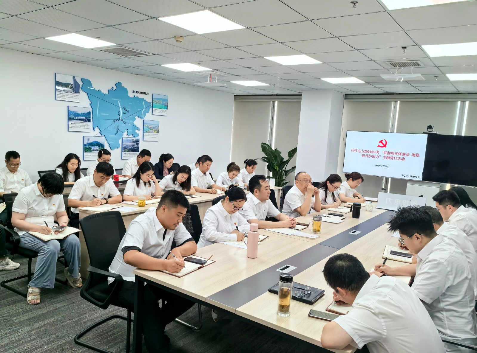 為貫徹落實(shí)黨中央關(guān)于加強(qiáng)和改進(jìn)保密工作的決策部署,深入傳達(dá)落實(shí)習(xí)近平總書記就保密工作作出的一系列重要指示批示精神,5月24日,川投電力機(jī)關(guān)黨支部召開5月“貫徹落實(shí)保密法  增強(qiáng)提升護(hù)密力”主題黨日活動,并結(jié)合黨紀(jì)學(xué)習(xí)教育開展專題學(xué)習(xí)研討。會議由支部書記李天宏主持,支部全體黨員、入黨積極分子、民主黨派人士參加會議。