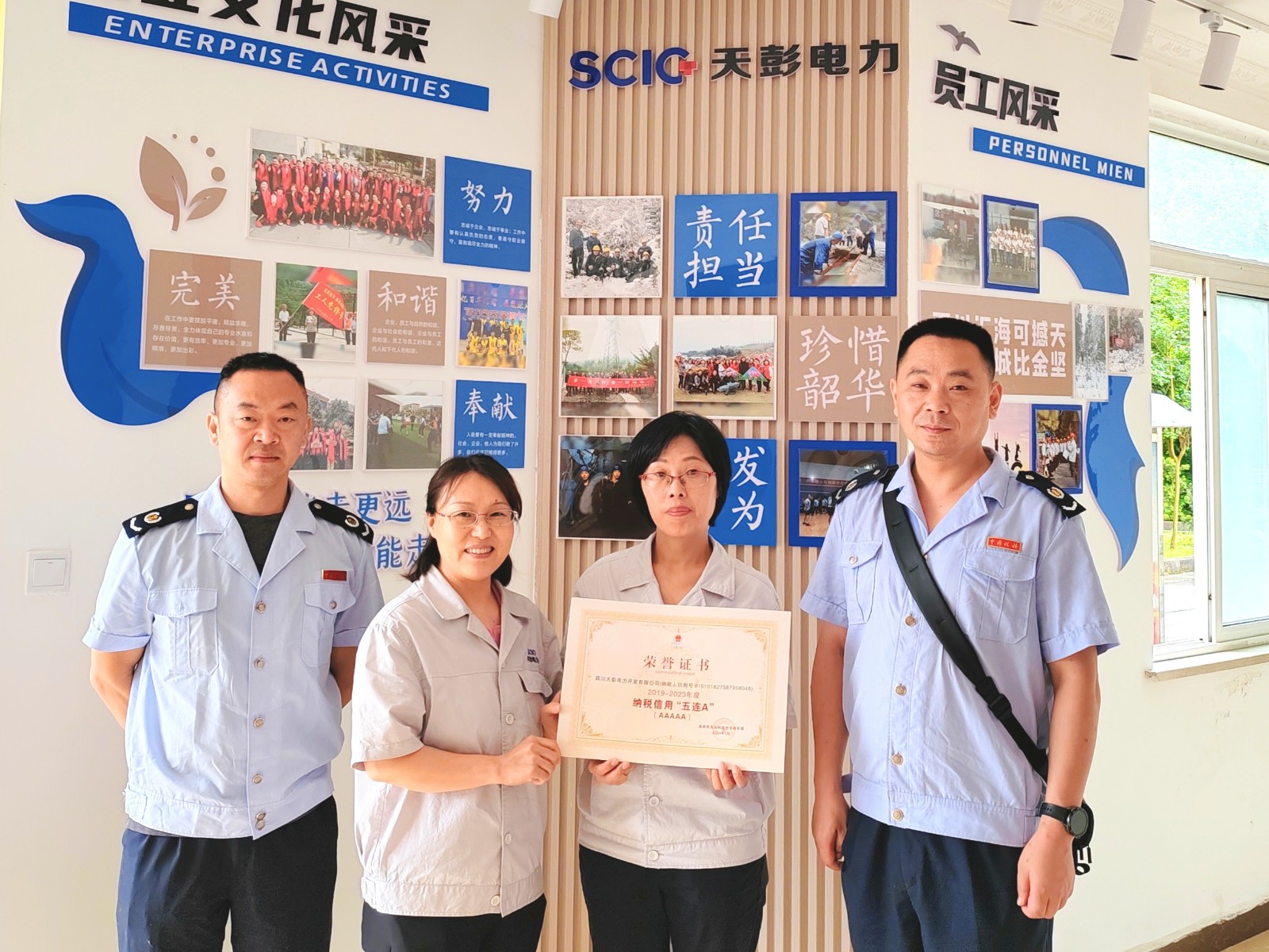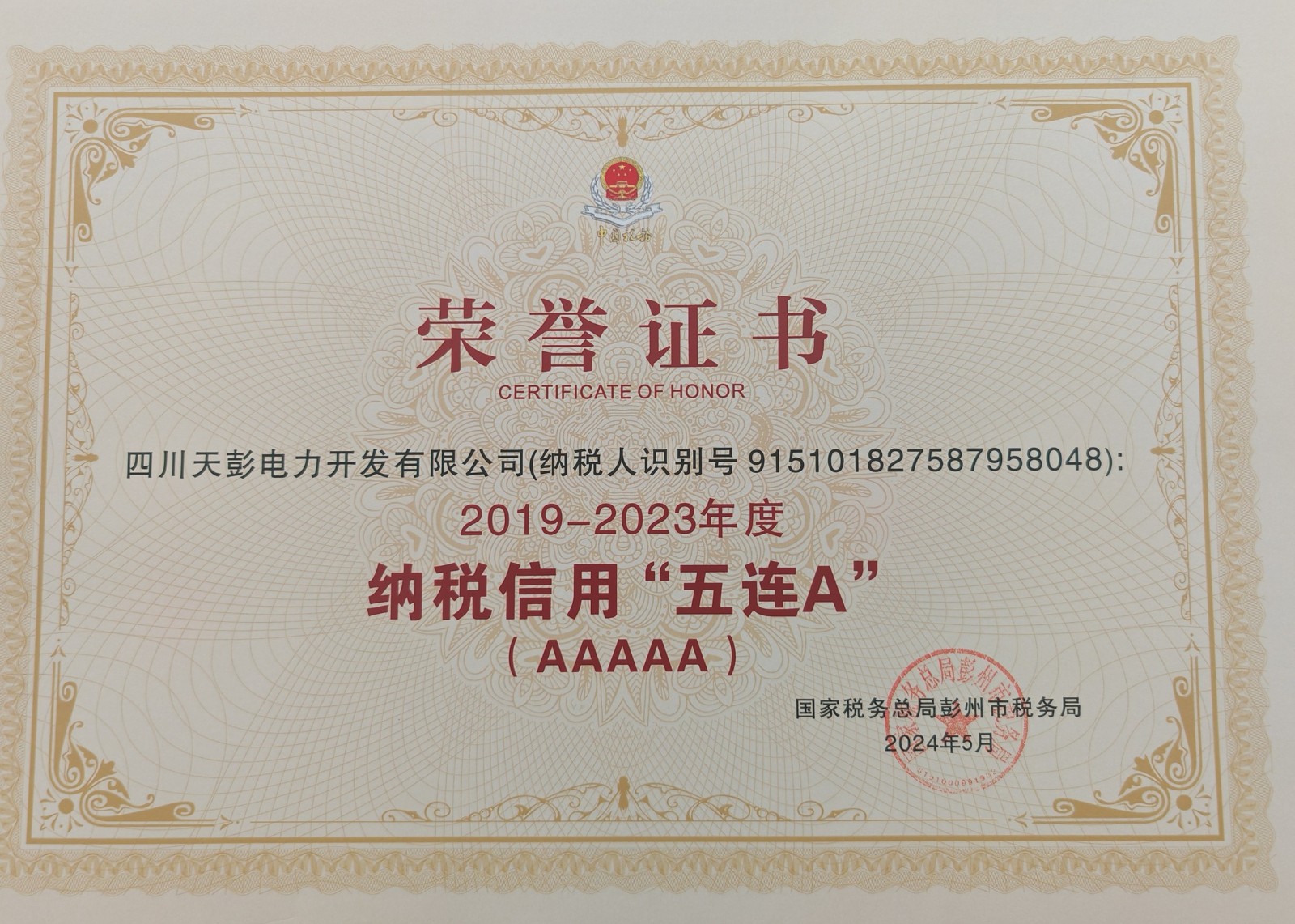 6月11日,天彭電力喜獲殊榮:國家稅務(wù)總局彭州市稅務(wù)局向我公司授予了“彭州市‘2019-2023年度納稅信用五連A’”榮譽證書,這是稅務(wù)機關(guān)對我公司誠信納稅、守法經(jīng)營的肯定和表彰。