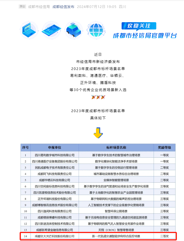 近日,成都市經(jīng)信局市新經(jīng)濟(jì)委發(fā)布2023年度成都市標(biāo)桿場(chǎng)景名單,交大光芒新一代軌道交通智能供電綜合監(jiān)控場(chǎng)景榮獲三等獎(jiǎng)。