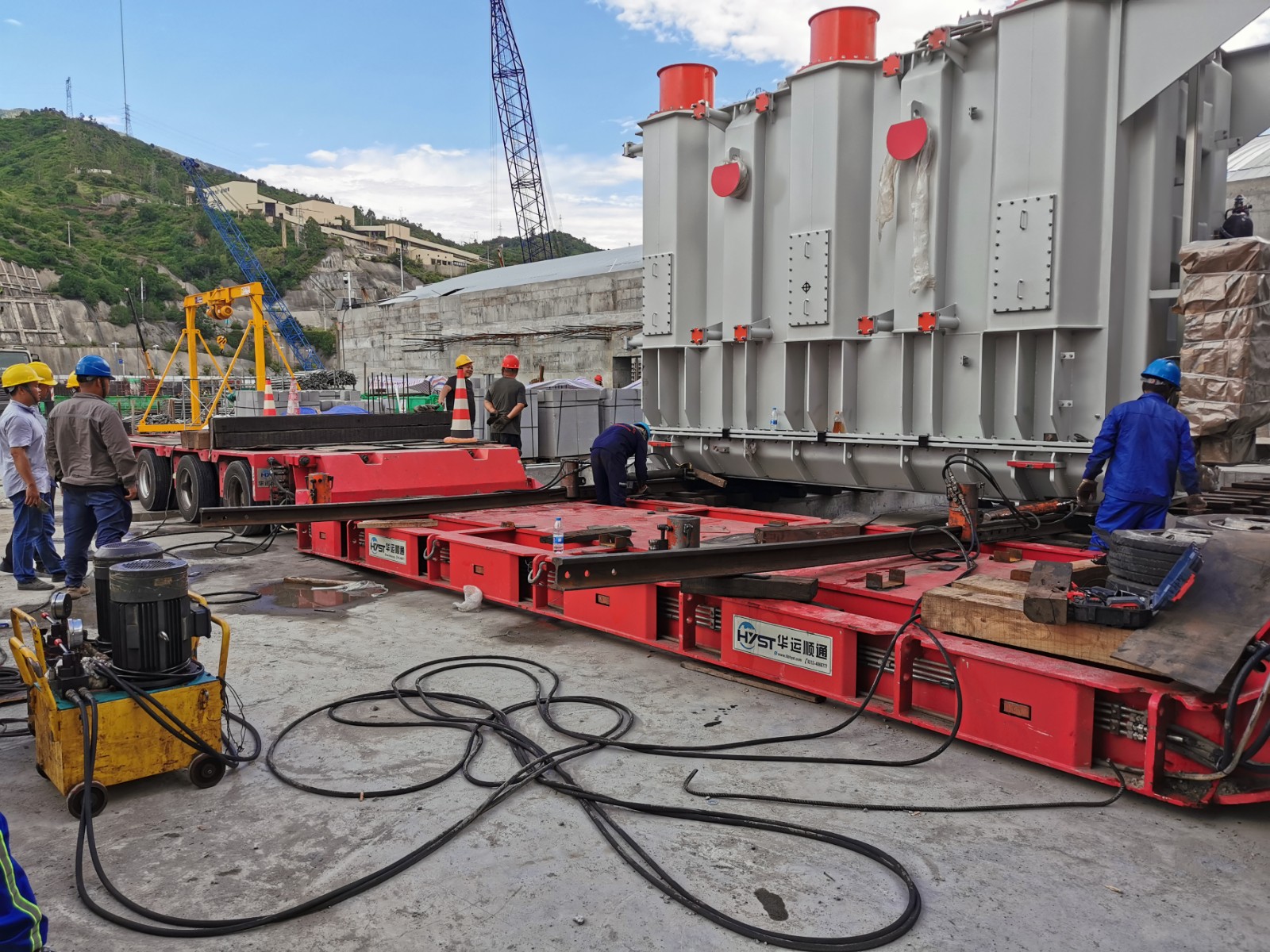 銀江水電站共3臺(tái)容量為150MVA的主變壓器,承擔(dān)著將發(fā)電機(jī)產(chǎn)生的電能傳輸至高壓電網(wǎng)的重要作用,1號(hào)主變壓器是1號(hào)、2號(hào)機(jī)組發(fā)電并網(wǎng)的主要設(shè)備,電氣主接線采用2臺(tái)機(jī)組接入1臺(tái)主變壓器的擴(kuò)大單元接線方式,單臺(tái)變壓器總重量達(dá)144噸,充氮運(yùn)輸重量達(dá)99噸。該變壓器由新疆運(yùn)輸?shù)姐y江工地,行程4000多公里,耗時(shí)10余天,按照公司制定的詳細(xì)運(yùn)輸、就位和安全保障方案,檢查核對(duì)土建基礎(chǔ)誤差,認(rèn)真測量并標(biāo)記出主變和基座的中心線,對(duì)具體安裝工作督導(dǎo)把關(guān),每個(gè)環(huán)節(jié)都嚴(yán)格按照規(guī)范操作,確保了首臺(tái)主變壓器高效精準(zhǔn)安裝就位。