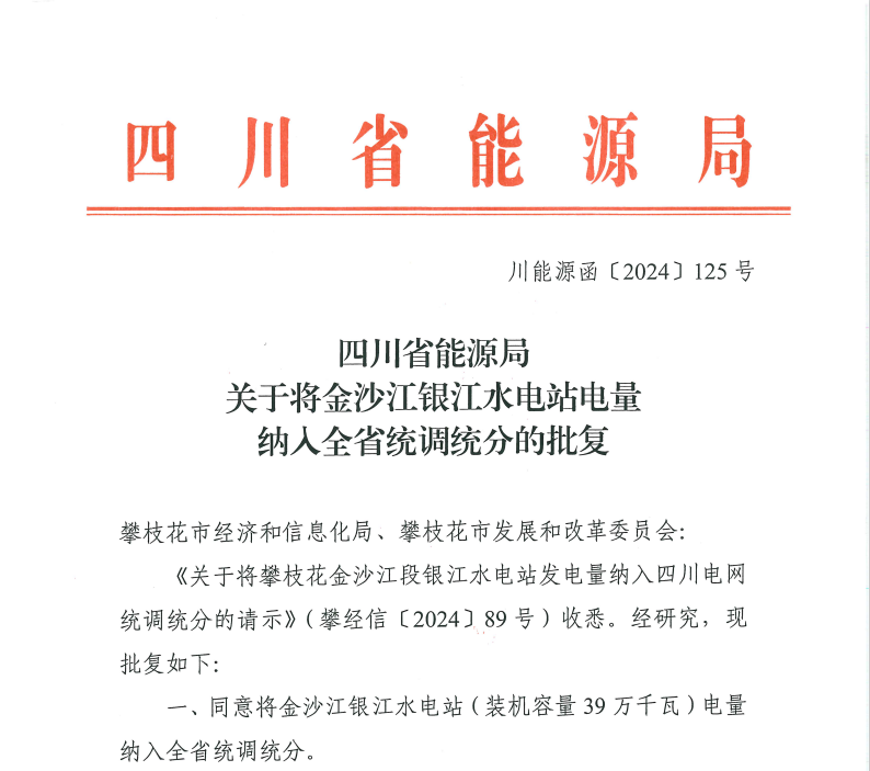 8月27日,在四川省能源局、攀枝花市有關部門和川投能源的指導幫助下,經(jīng)過積極對接、多方協(xié)調(diào),攀水電公司成功取得四川省能源局將銀江水電站電量納入全省統(tǒng)調(diào)統(tǒng)分的批復,為實現(xiàn)銀江水電站2024年首臺機組投產(chǎn)發(fā)電目標再增“助推器”。