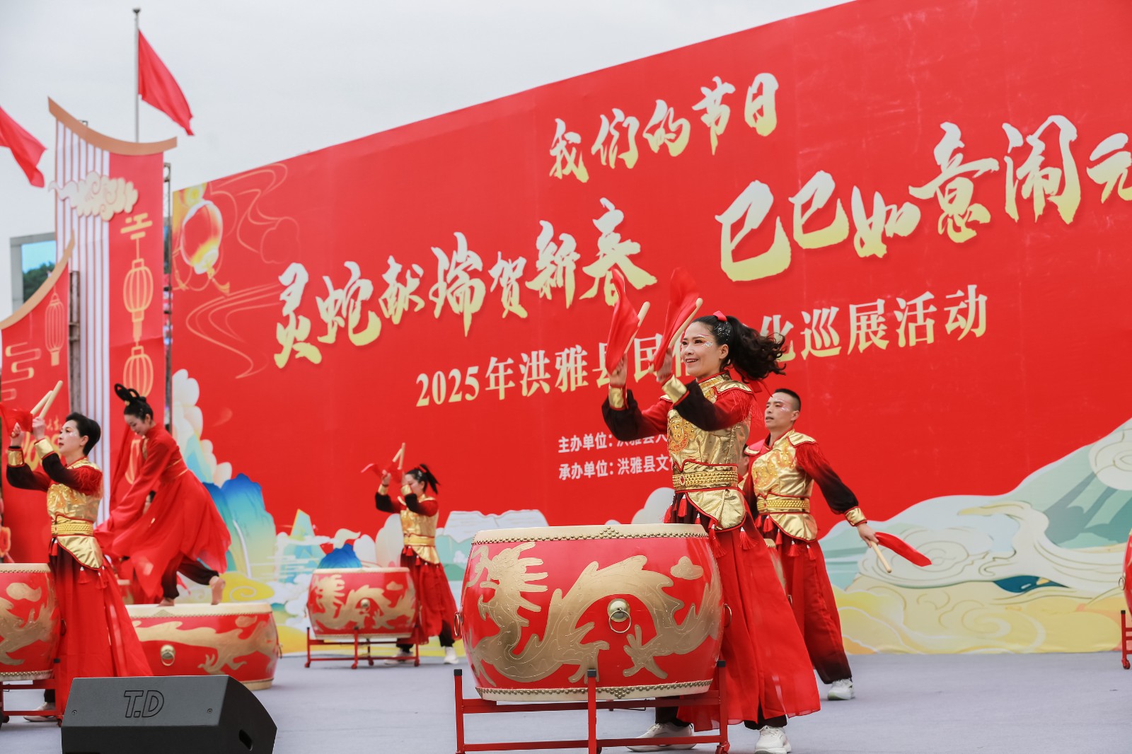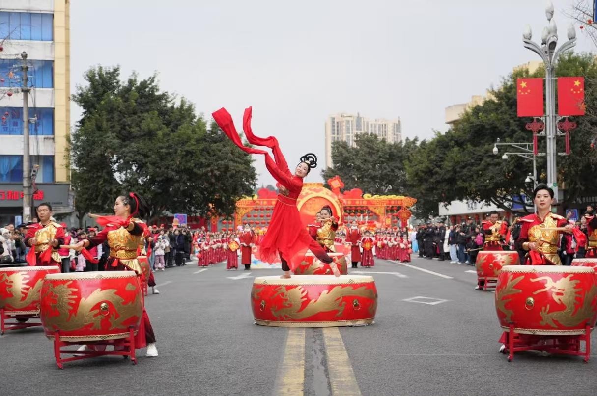 洪雅民俗文化巡展活動是洪雅縣每年春節(jié)期間的傳統(tǒng)文化品牌,表演節(jié)目豐富多彩、精彩紛呈,深受全縣人民喜愛?;顒赢?dāng)日,民俗文化巡游隊伍從三彩廣場出發(fā),一直到洪雅廣場,現(xiàn)場人頭攢動,熱鬧非凡。隨著激昂的鼓點響起,大鼓隊員們手中的鼓槌上下翻飛,富有節(jié)奏感地敲擊著大鼓。磅礴的氣勢、靈動的韻律、美妙的舞姿瞬間點燃了現(xiàn)場氣氛,吸引了眾多市民駐足觀看、拍手稱贊。