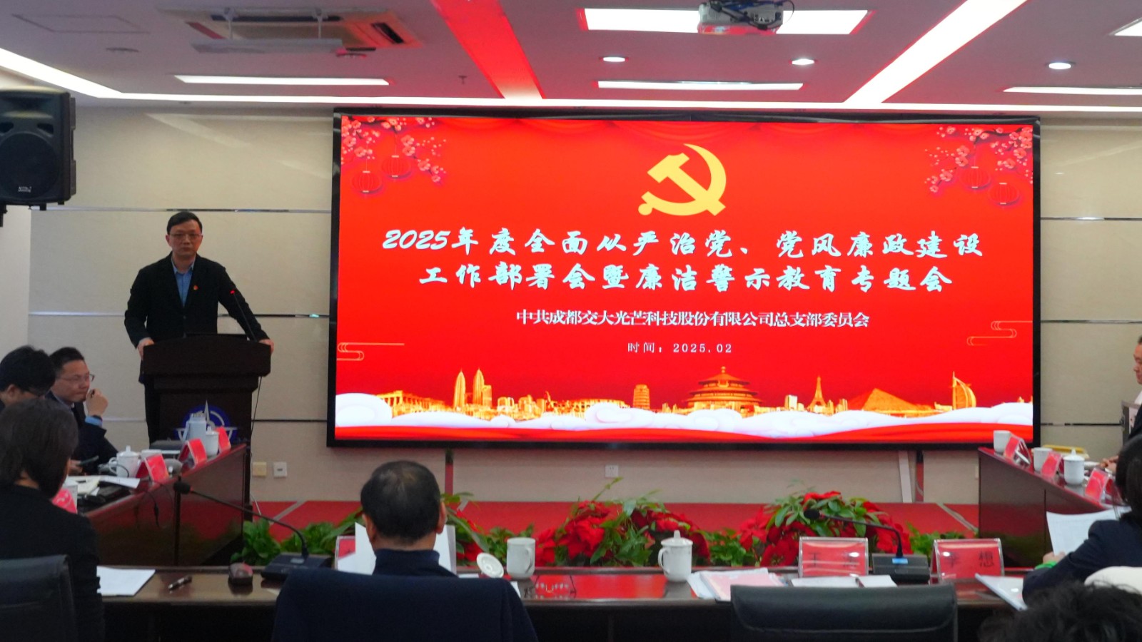 為深入學(xué)習(xí)貫徹二十屆中紀(jì)委四次全會精神,深入推進(jìn)公司黨風(fēng)廉政建設(shè)和反腐敗工作,2月21日,交大光芒黨總支召開2025年度全面從嚴(yán)治黨、黨風(fēng)廉政建設(shè)工作部署會暨廉潔警示教育大會,黨總支書記、常務(wù)副總經(jīng)理王濤主持會議,公司領(lǐng)導(dǎo)班子成員、主管及以上管理人員、黨員參加會議。
