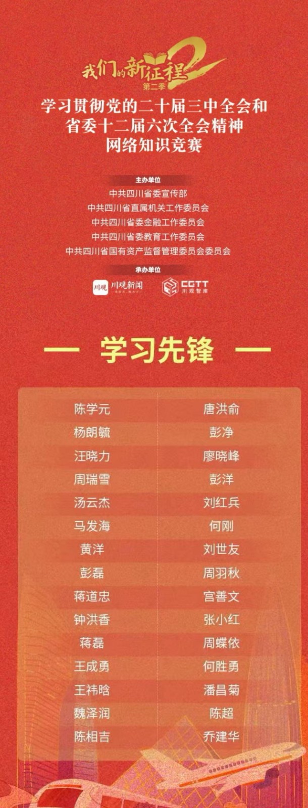 近日,由中共四川省委宣傳部、省委省直機(jī)關(guān)工委、省委金融工委、省委教育工委、省國資委黨委聯(lián)合主辦,四川日報報業(yè)集團(tuán)承辦的“我們的新征程”(第二季)網(wǎng)絡(luò)知識競賽公布了獲獎名單,并為獲獎人員發(fā)放獎牌,川投電力所屬天彭電力11名員工憑借扎實的理論功底和鍥而不舍的努力,從全省32萬余名參與競賽的黨員群眾中脫穎而出,進(jìn)入全省個人排行榜前30名,榮獲“學(xué)習(xí)先鋒”稱號。