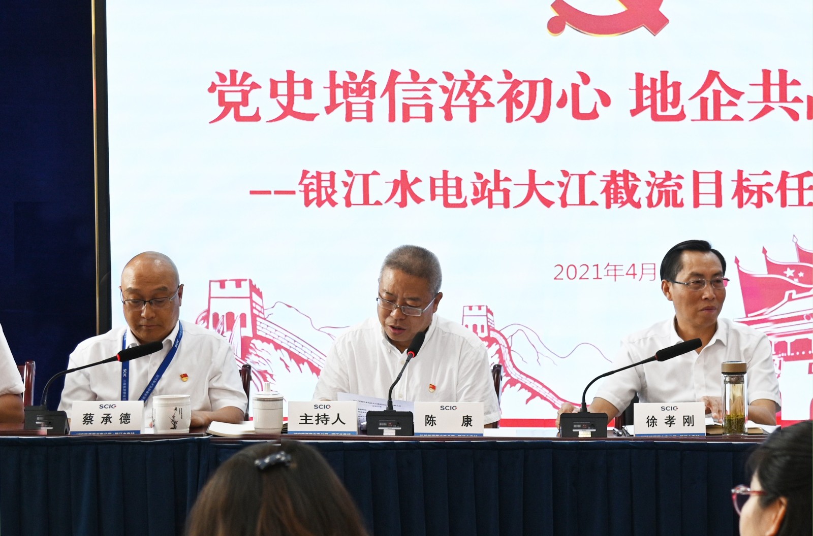 會(huì)議由東區(qū)區(qū)委常委、政法委書記、銀江水電站項(xiàng)目推進(jìn)領(lǐng)導(dǎo)小組常務(wù)副組長(zhǎng)陳康主持,川投能源副總經(jīng)理、攀水電公司黨總支書記、董事長(zhǎng)徐孝剛,黨總支副書記、總經(jīng)理蔡承德,副總經(jīng)理周軍及公司黨員代表和東區(qū)政府相關(guān)部門等共計(jì)40 余人參會(huì)。